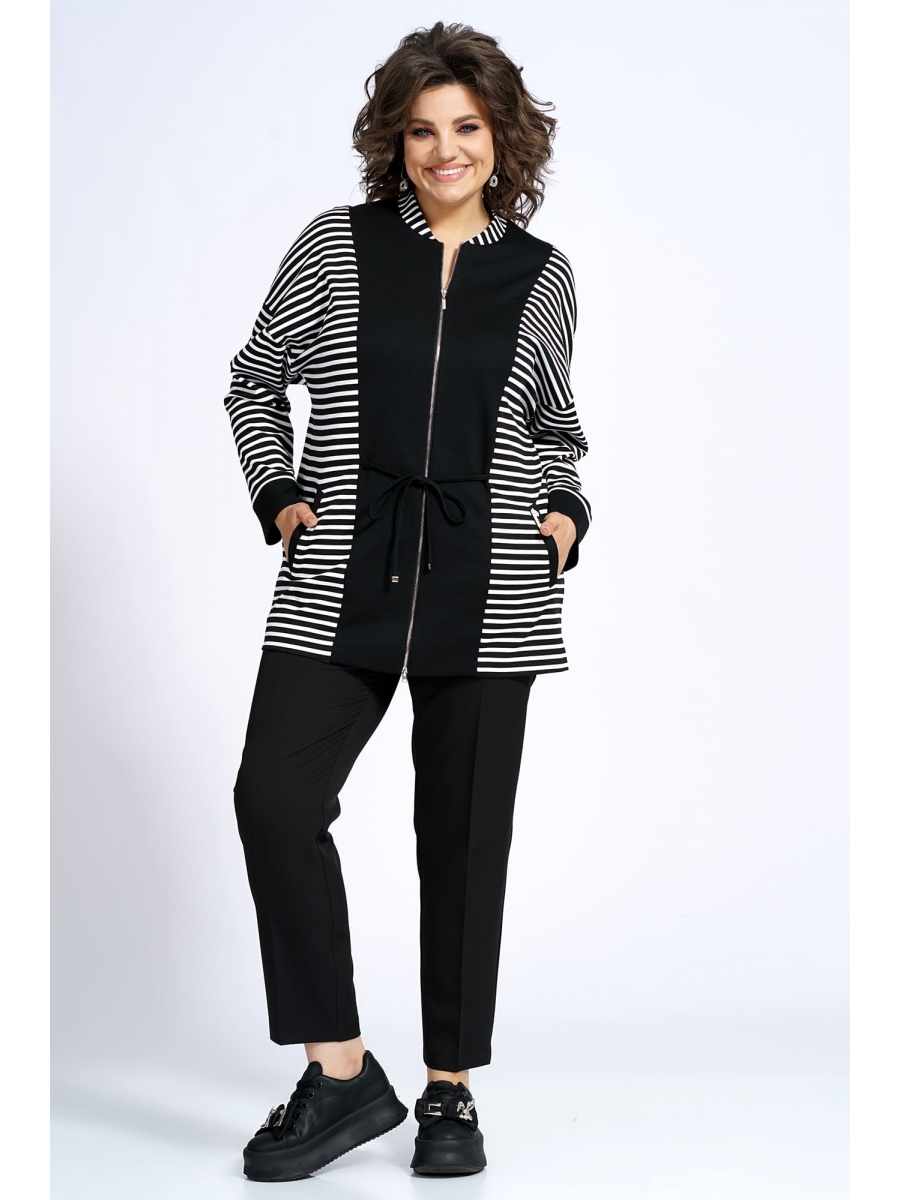 Блейзер прямого, свободного силуэта, с застёжкой на тесьму-молнию и завязка по центру переда, со спущенной линией плеча. Перед с рельефными швами, прорезными кармана с листочкой. Спинка с рельефными швами, по центру с навесным поясом. Рукава втачные, одношовные, длинные понизу с притачными манжетами. Воротник стойка.