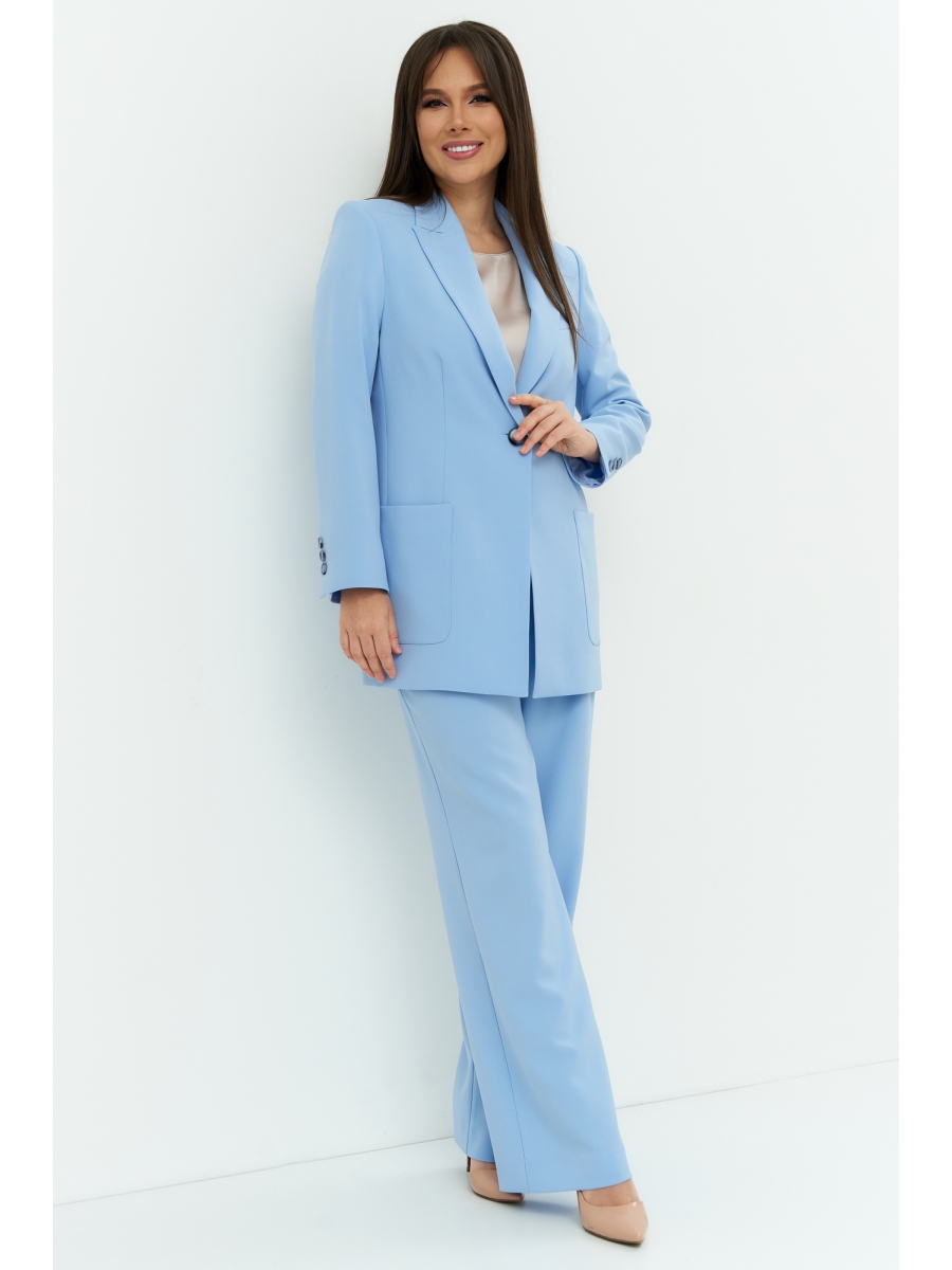Стильный комплект из жакета, блузы и брюк. Удлиненный жакет прямого кроя, на подкладке с центральной застежкой на пришивную пуговицу. Выполнен из костюмной ткани. Дополнен боковыми накладными карманами. Рукав встачной. Блуза прямого кроя, выполнена из шифона. Широкие брюки прямого кроя с притачным поясом, с застежкой на пришивную пуговицу и молнию. Посадка слегка завышена. Дополнены функциональными боковыми карманами.