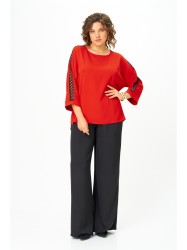 Блуза женская из текстильной ткани. Прямого силуэта. По спинке расположен подрез. В шов вставлено кружево. Рукав 3/4, спущенный с манжетой. По плечевому шву вставлено кружево. Вырез лодочка. Обработан притачной бейкой.