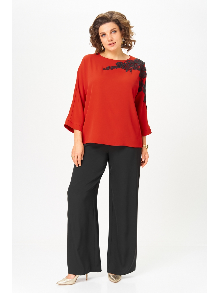 Блузка женская из текстильной ткани с цельнокроеным рукавом. Прямого силуэта. По переду блузки настрочена аппликация. По спинке расположен средний шов. Рукав 3/4, низ рукава с манжетой. Вырез горловины круглый, обработан обтачкой. Блузка застегивается на петлю-пуговицу.