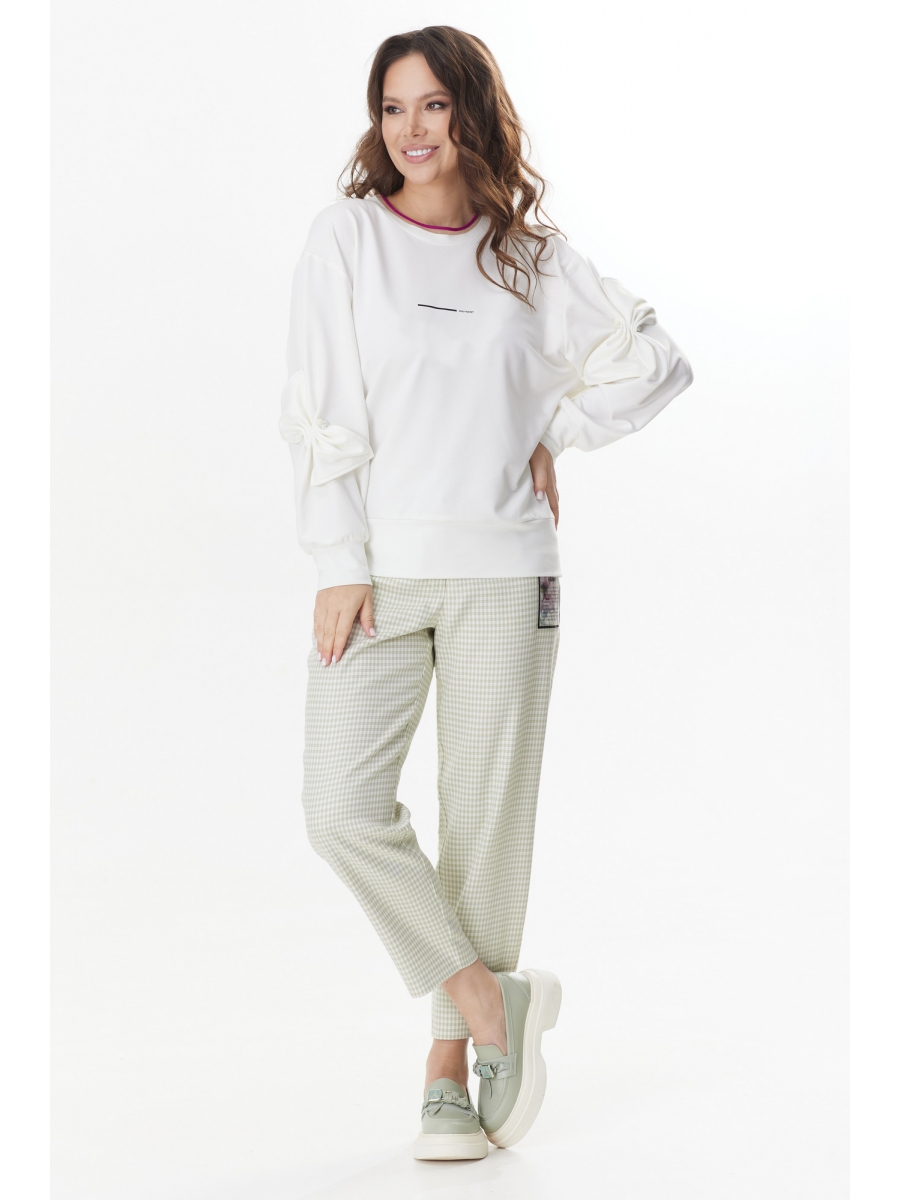Джемпер свободного кроя. Выполнен из белого трикотажного полотна средней плотности. Горловина округлой формы. Рукав спущен, дополнен притачной манжетой. Декоративные элементы на рукаве в виде бантов, выполненных из основной ткани, придают джемперу романтический образ. По груди джемпер дополнен термо аппликацией в виде надписи.