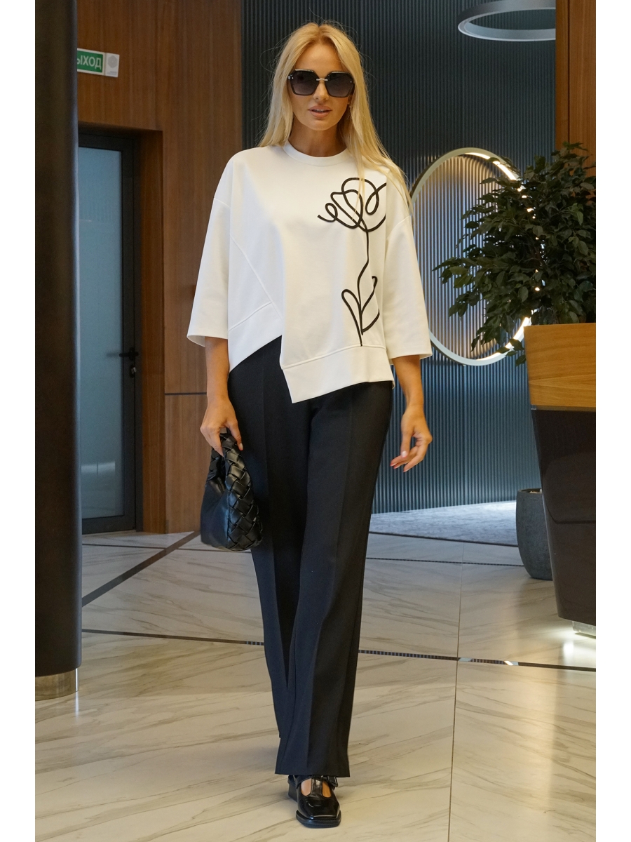 Блузон прямого, свободного силуэта, со спущенной линией плеча, перед и спинка с отрезным бочком, с разно-уровневым низом и притачным поясом. Рукава втачные, одношовные, длиной ¾. По горловине бейка. Перед с декоративным элементом «цветок». Рукава втачные, одношовные, длиной ¾.