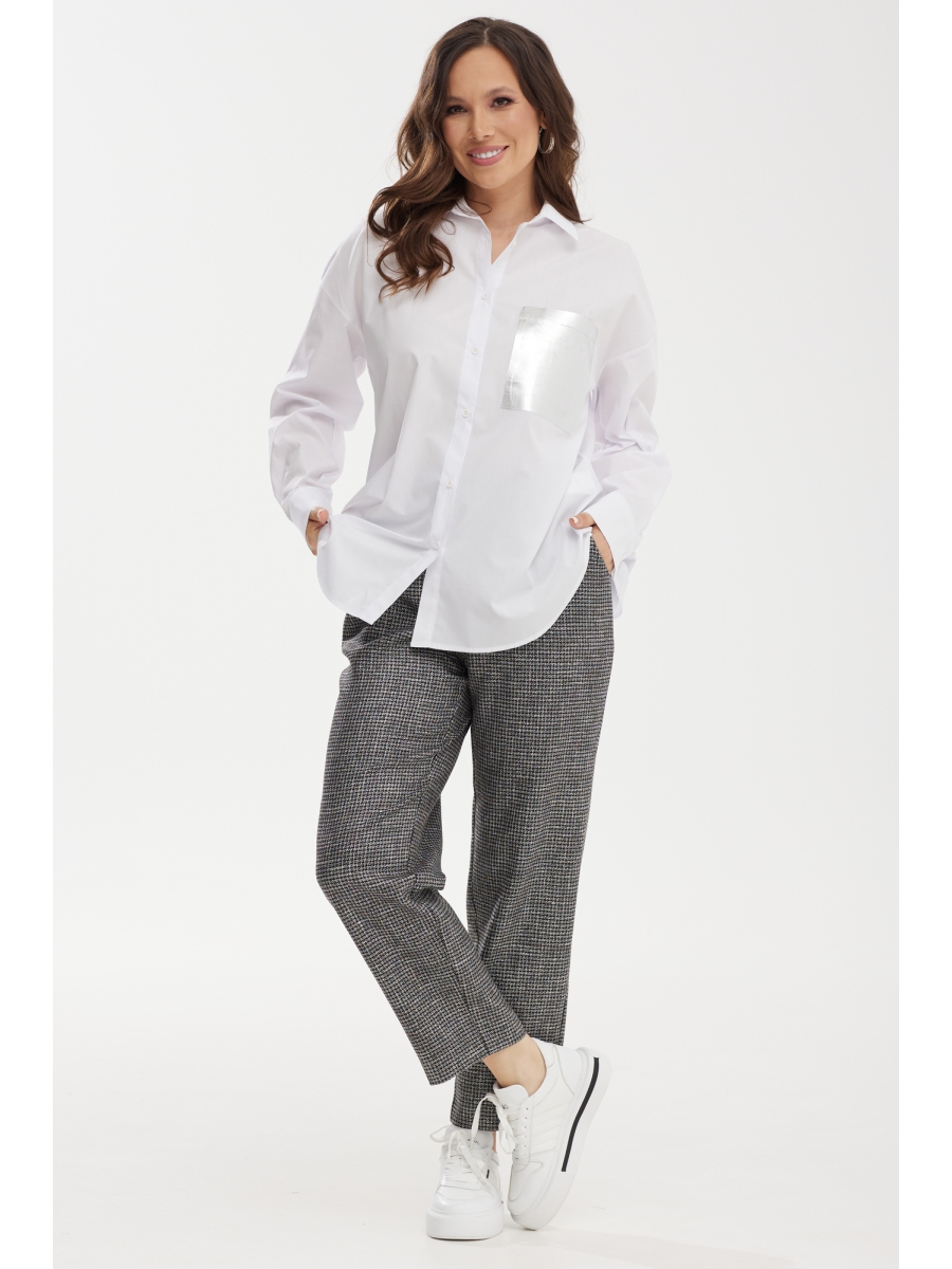 Блуза свободного рубашечного кроя с центральной застежкой на пришивные пуговицы. Выполнена из хлопковой рубашечной ткани. Горловина обработана отложным воротником на стойке. Рукав втачной, слегка спущен. Дополнен притачной манжетой с застежкой на пришивные пуговицы.