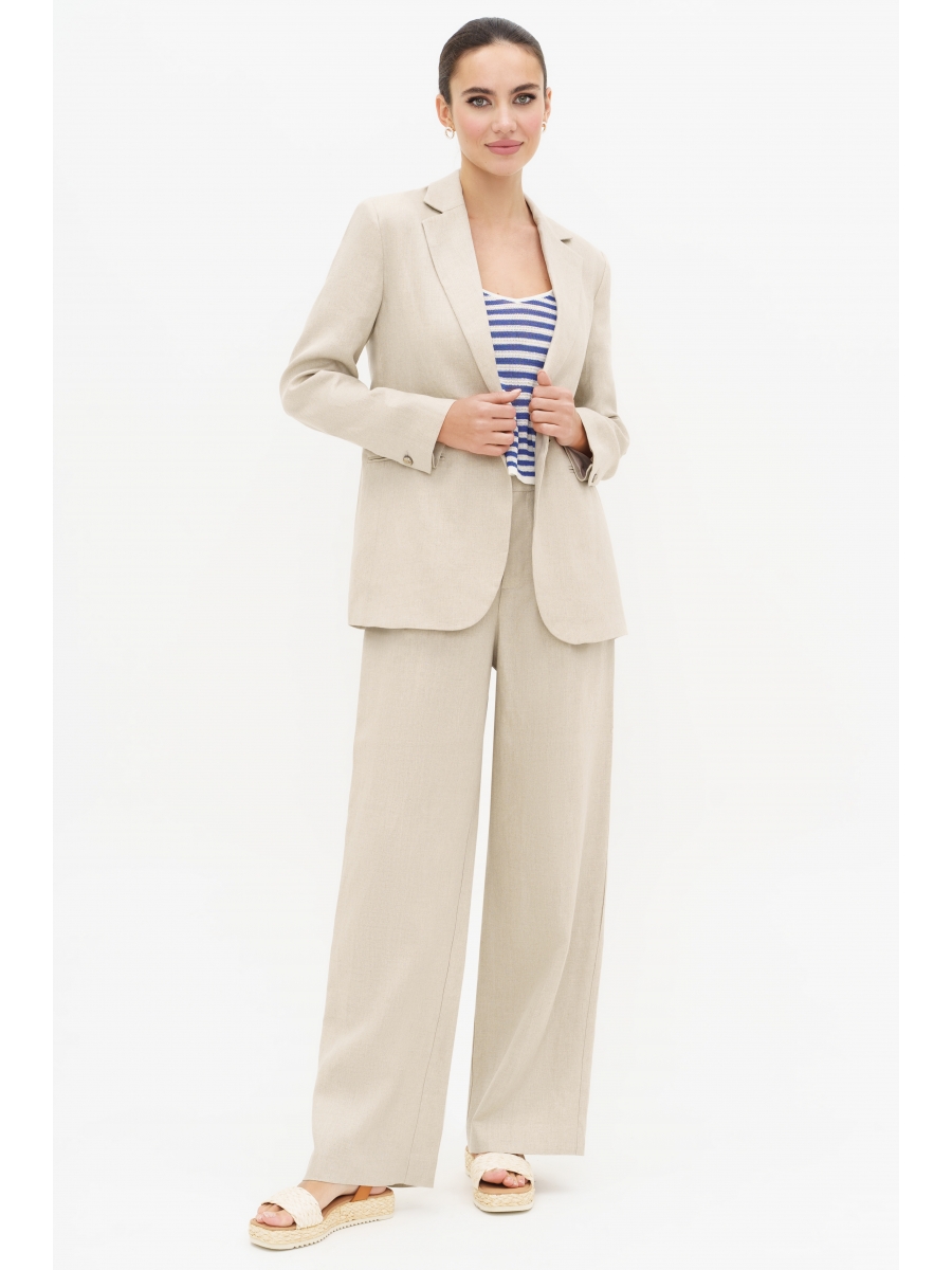 Костюм женский двухпредметный, состоит из жакета и брюк, выполненных из льна.
