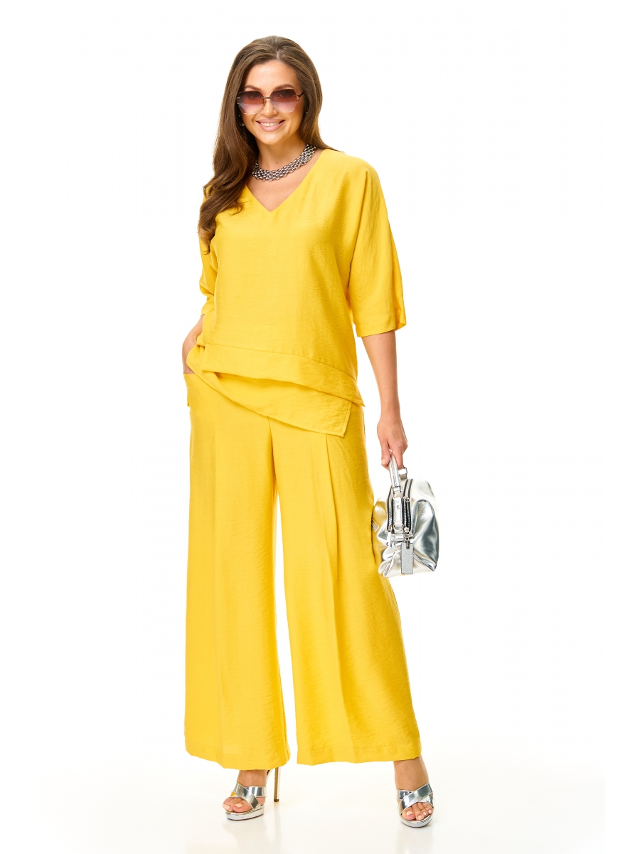 Очень стильный, элегантный, модный женский комплект, из легкой ткани хорошего качества, свободного интересного дизайна, состоит их брюк палаццо и блузона прямого силуэта, с интересным деталями по низу блузона. Рукав летучая мышь, что придает свободу движению и комфорта при носке. Вырез горловины V-образный. Карман прямой, функциональный, переходящий в складку, спереди на молнии и резинкой сзади и по бокам.
