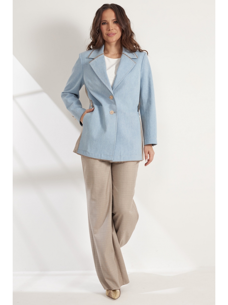 Жакет прямого свободного кроя, без подкладки, с центральной застежкой на пуговицы. Дополнен функциональными карманами. Перед жакета выполнен из плотного хлопкового джинса, спинка выполнена из поливискозной костюмной ткани. По спинке жакет дополнен декоративным съемным элементом в виде пояса.