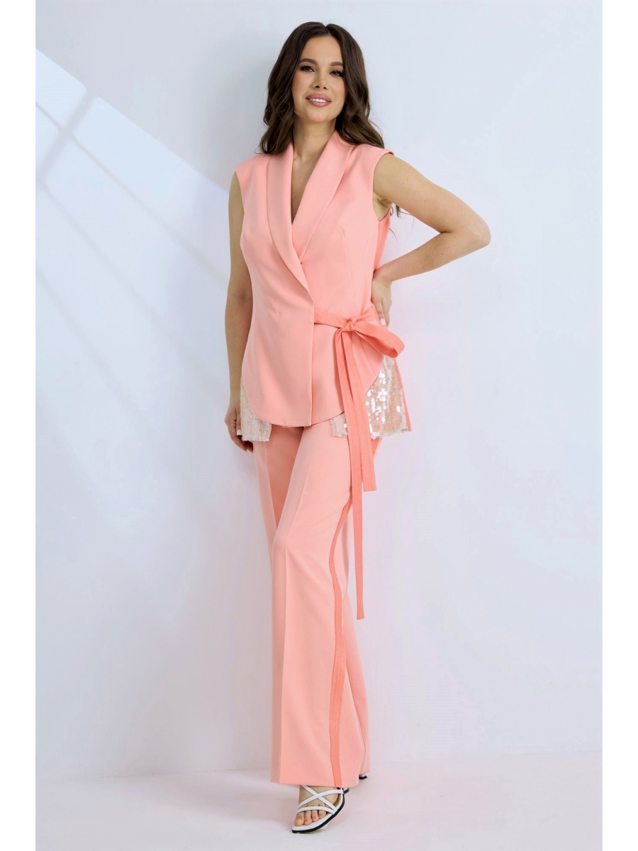 Жилет полуприлегающего силуэта, на подкладке, с центральной застежкой на потайные кнопки. Так же жилет дополнен пришивным поясом. Воротник отложной. Спинка и отделочные элементы жилета и брюк выполнены из слегка мерцающей поливискозной ткани, что придает комплекту неповторимый шарм. Так же жилет дополнен вставками из сетки с мерцающими пайетками.