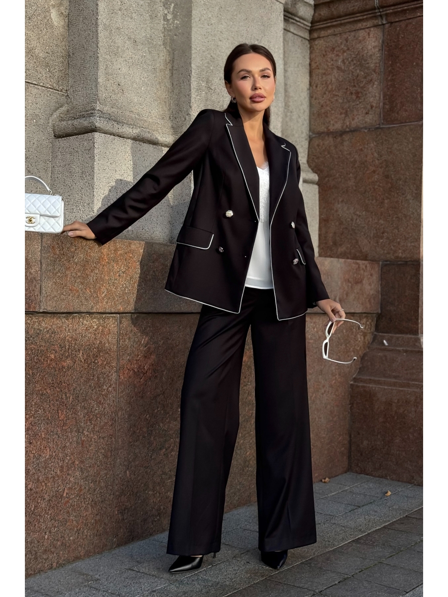 Женский брючный костюм URS — воплощение современного стиля, элегантности и уверенности. Этот черный костюм женский брючный создан для женщин, которые ценят безупречный внешний вид и классику в лучших традициях деловой моды. Элегантный жакет с серебристым кантом и аккуратными декоративными пуговицами придает образу изысканность и подчеркивает статус. Прямые брюки визуально вытягивают силуэт, создавая стройную и женственную линию.