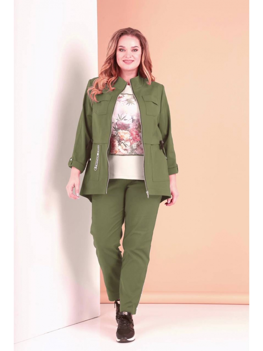 Жакет свободного кроя, отрезной по линии талии. Прилегание регулируется затягивающейся кулисой. Перед с нагрудными вытачками и двумя парами накладных карманов. Спинка с кокеткой, средним швом и навесной декоративной петлёй. Низ спинки длиннее по отношению к переду. Рукав длинный, втачной, легко трансформируется в длину 7/8 благодаря отложной манжете, которая фиксируется патой. Воротник-стойка. Центральная застёжка-молния.