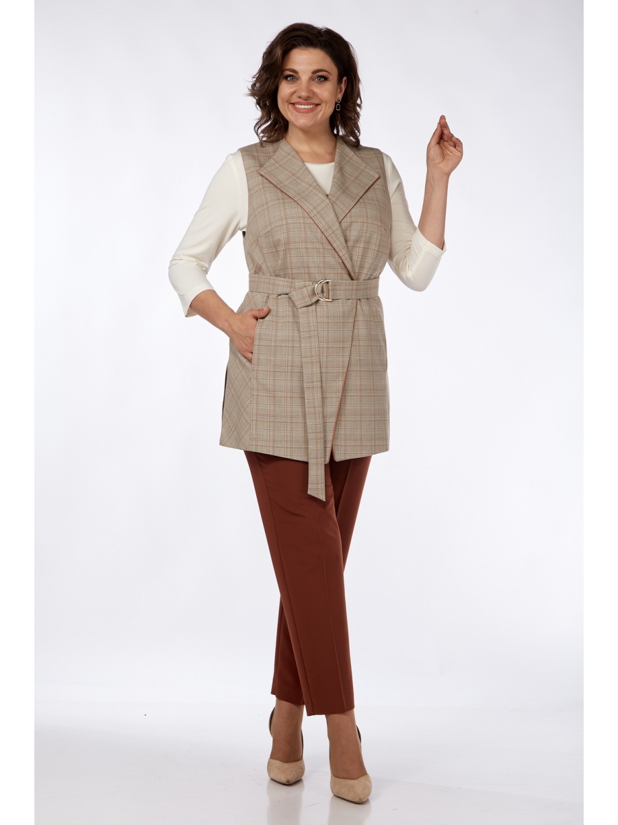 Жилет изготовлен из костюмной ткани. Застежка двубортная на петли и пуговицы с отложными лацканами. Перед жилета с нагрудными вытачками и с боковыми деталями, в которых обработаны карманы в швах. Спинка разрезная со средним швом. Изделие на подкладке. Декором служит кант по краю воротника и борту. В комплекте съемный пояс с кантом.