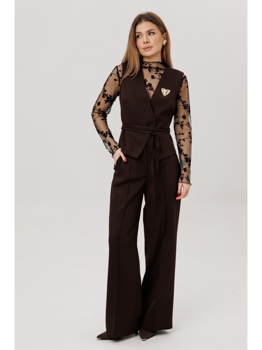 Жилет полуприлегающего силуэта. По переду и спинке рельефы. Застежка на две потайные кнопки. Жилет на подкладке с поясом. Съёмная брошь входит в комплект.