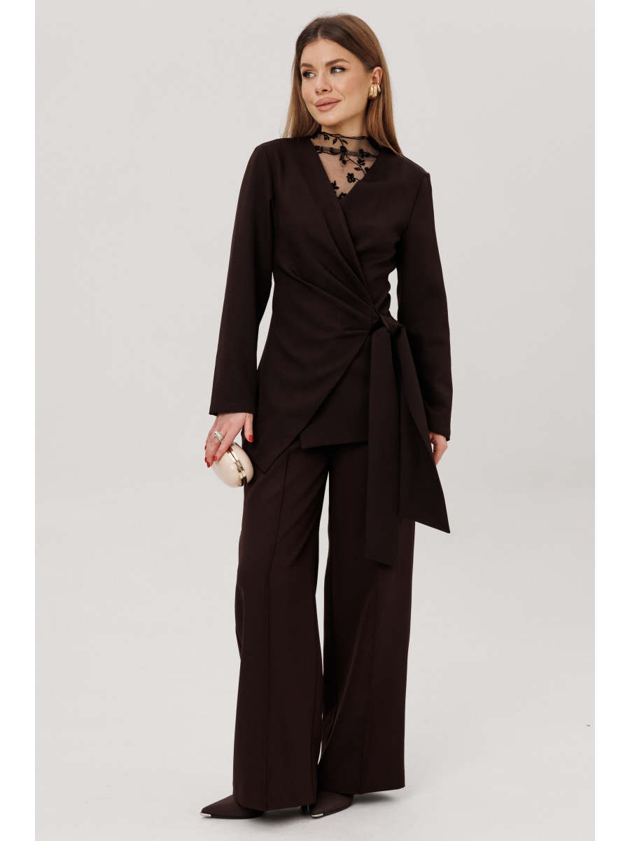 Жакет на запах приталенного силуэта с V-образным вырезом. По переду заложены складки. Застежка в виде пояса. Перед жакета на подкладке. Полочки ассиметричные по низу с заостренными углами.