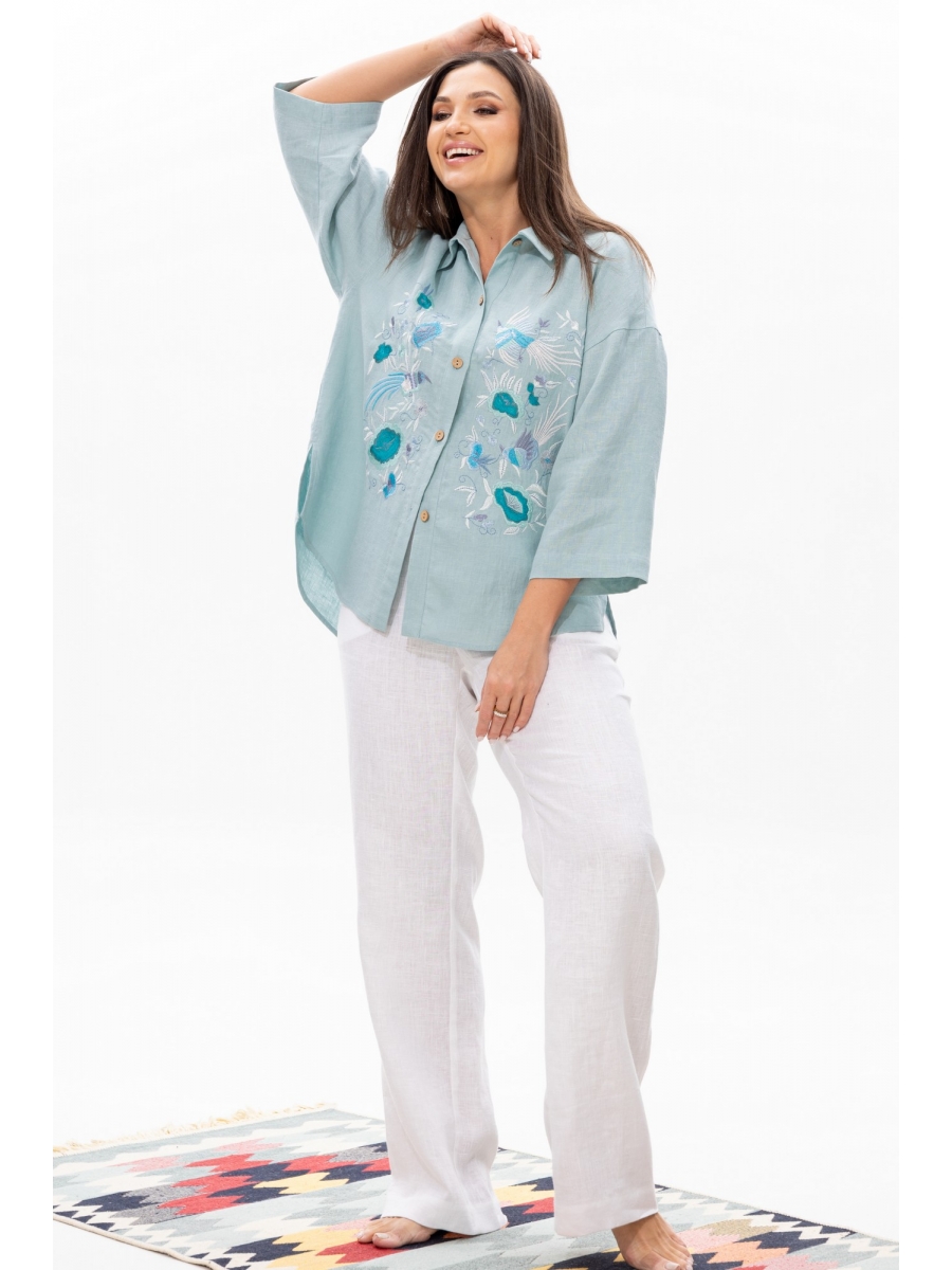 Рубашка свободного силуэта. Воротник отложной рубашечного типа. Застежка центральная на петли и пуговицы, спинка с кокеткой. На полочке расположены две симметричные дизайнерские вышивки. Рукав 3/4 со спущеной линией плеча, одношовный.