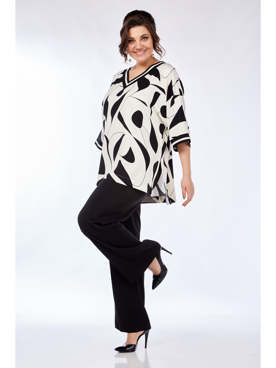 Туника свободного силуэта из вискозной ткани. Горловина V-образной формы. По низу рукавов и горловине вставлен довяз. Рукава-цельнокроенные. В боковых швах внизу блузы обработаны разрезы.