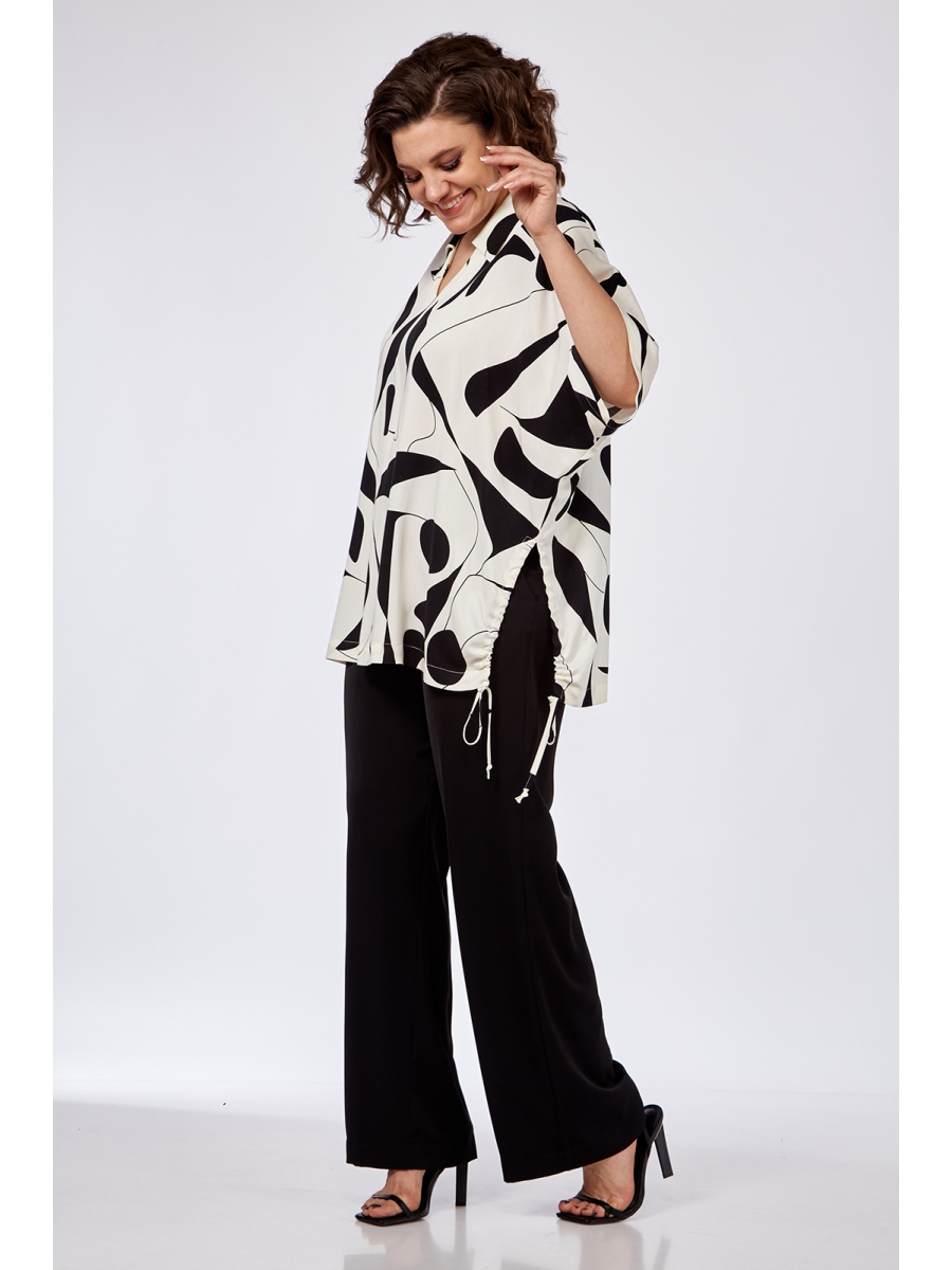Туника свободного силуэта из вискозной ткани. Горловина оформлена воротником, спереди фигурный вырез. Рукава цельнокроеные. В боковых швах внизу обработаны высокие разрезы со стяжкой.