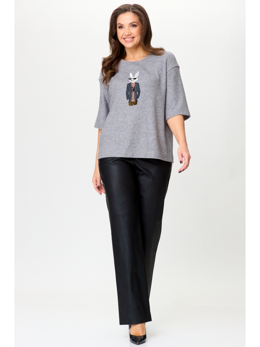 Стильный двухпредметный комплект Ma Сhérie, состоящий из трикотажного джемпера и брюк из экокожи. Джемпер свободного силуэта. Горловина округлая, обработана обтачкой. Полочка цельная, на груди дизайнерская вышивка ""заяц"". Спинка со средним швом. Рукав одношовный втачной длиной по локоть, линия плеча спущена.
