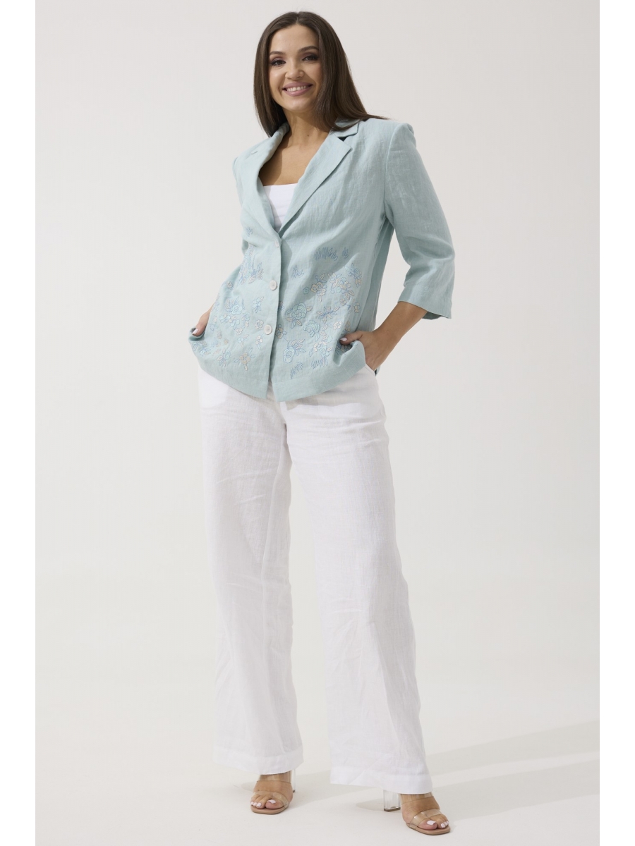 Жакет свободного силуэта. Воротник пиджачного типа, застежка центральная на три петли и пуговицы. Снизу полочки декоративная дизайнерская вышивка. Спинка со средним швом, который заканчивается шлицей, и талиевыми вытачками. Рукав двухшовный втачной, длиной 3/4.