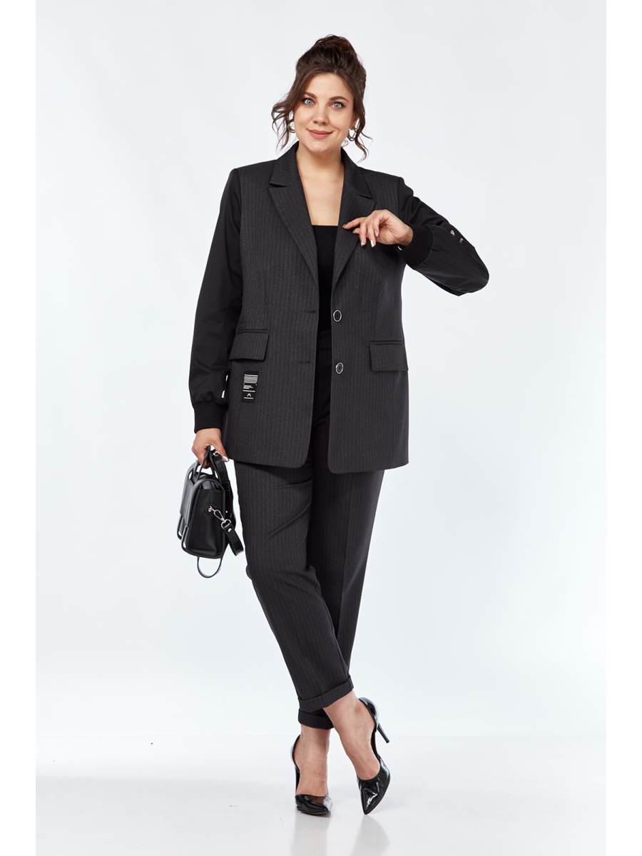 Жакет прямого силуэта выполнен путем комбинирование тканей нескольких видов. Перед жакета из костюмной ткани в полоску, верхняя часть спинки и рукава из х/б плащевки. Воротник пиджачного типа, застежка центральная на две петли и пуговицы, карманы прорезные с клапаном. Спинка разрезная по линии талии верхняя часть с небольшой сборкой, в нижней части спинки обработана шлица. Жакет на подкладке. Рукава втачные, двухшовные по низу манжеты из довяза. На левом рукаве настрочной карман с молнией.