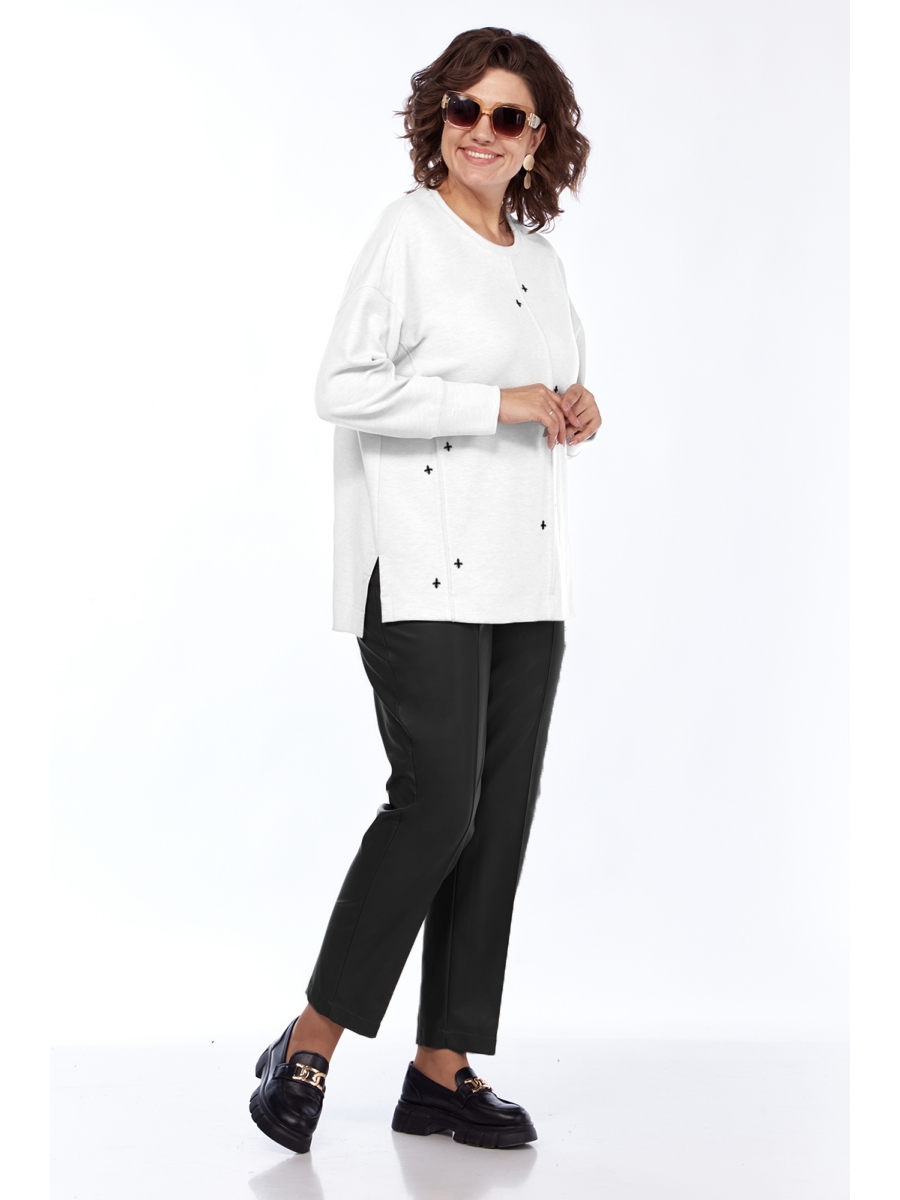 Джемпер свободного силуэта выполнен из трикотажного полотна. Горловина обработана планкой. Перед с центральным швом и с боковыми рельефами которые декоративно отстрочены. Спинка цельная. Рукава спущенные на широкой манжете. В боковых швах разрезы. Джемпер декорирован дизайнерской вышивкой.