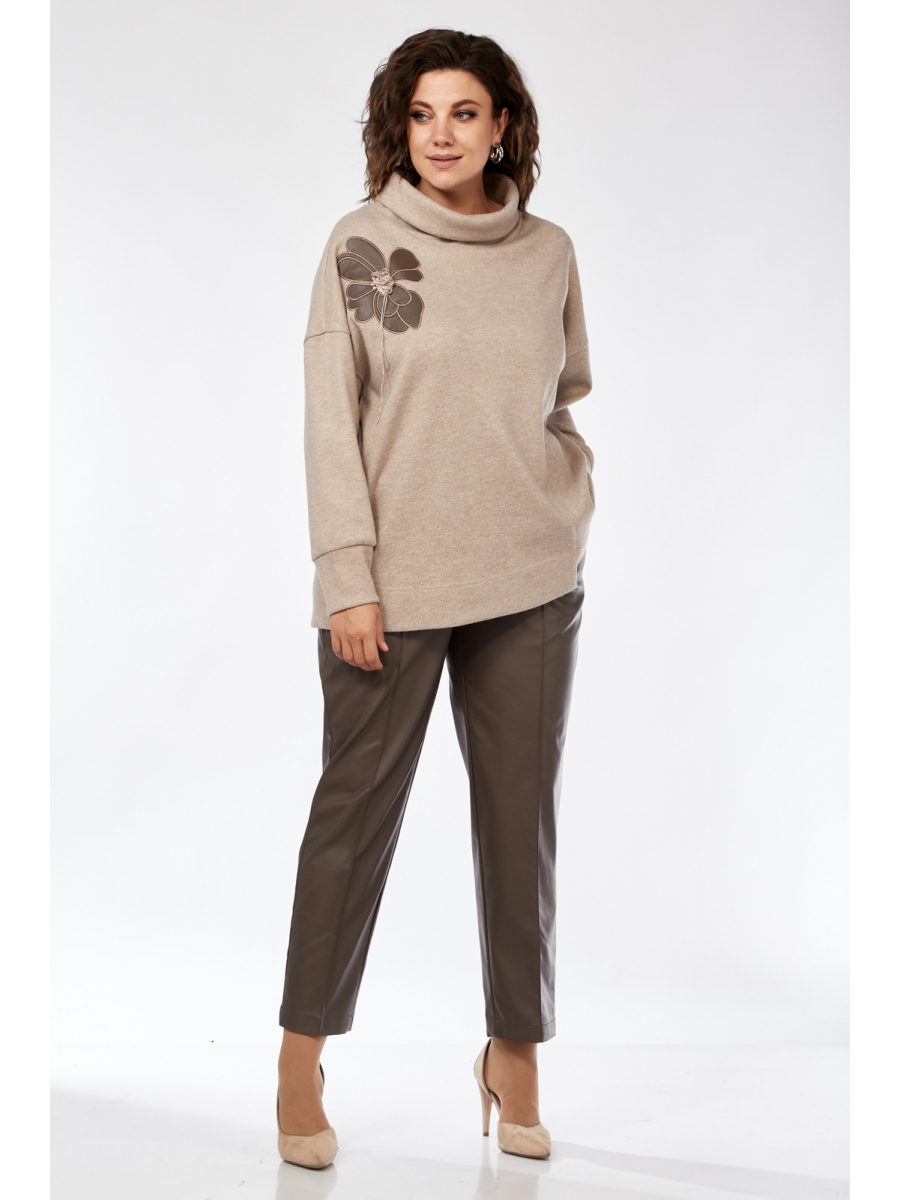 Джемпер свободного кроя, изготовлен из трикотажного полотна. Перед разрезной с фигурным низом. Горловина обработана воротником -хомут. Спинка цельнокроеная. Декором служит вышивка — аппликация.