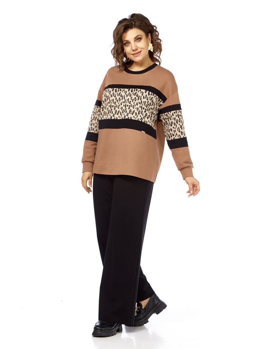 Джемпер выполнен путем комбинирования трикотажного полотна разной расцветки. Горловина круглой формы с отделкой в виде планки. Перед и рукава разрезные с декоративными вставками. Спинка цельнокроенная. Рукава спущенные на манжетах.