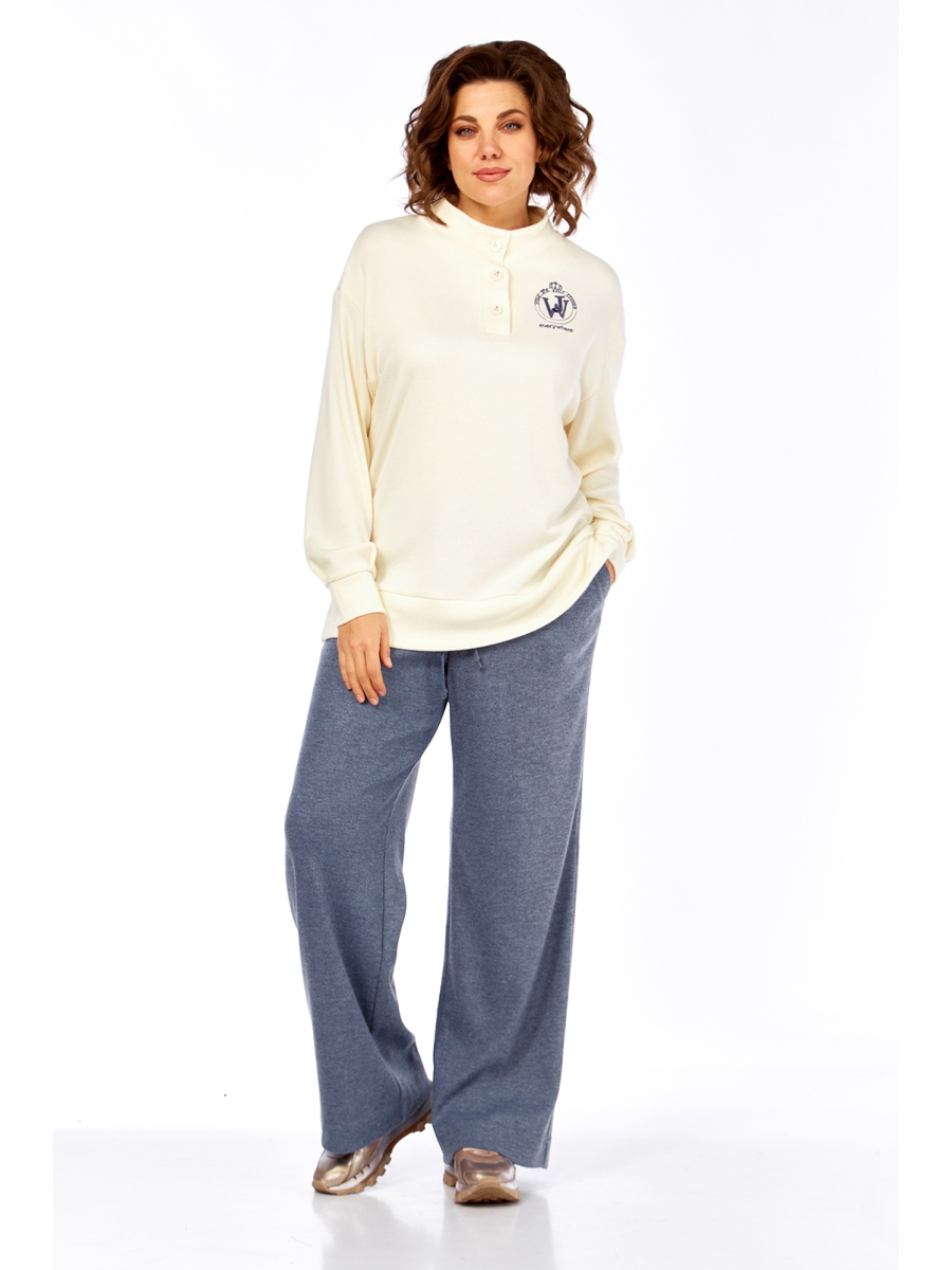 Джемпер свободного кроя, изготовлен из трикотажного полотна. Горловина обработана воротником-стойкой и планками с застежкой на петли и пуговицы. Рукава спущенные, с манжетами. По низ изделия притачная деталь с разрезами по бокам. На полочке джемпера расположена вышивка.