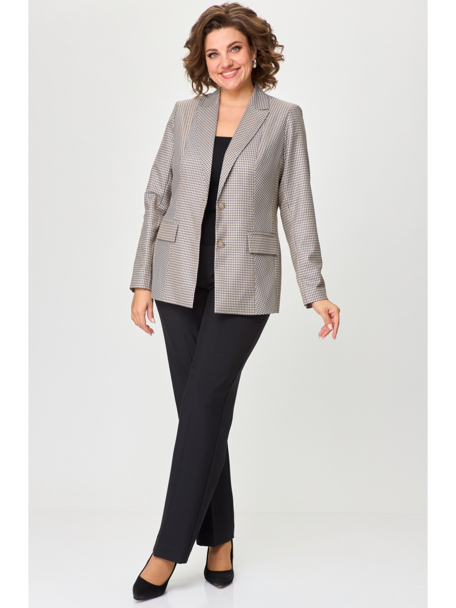 Жакет удлиненный, полуприлегающего силуэта с центральной бортовой застежкой на пуговицы до линии перегиба лацкана. Спереди рельефные швы от плечевого шва, отрезной бочок и карман с клапаном. Спинка с рельефами от плечевого шва. Рукав втачной, двухшовный. Воротник пиджачного типа. Жакет на подкладке.