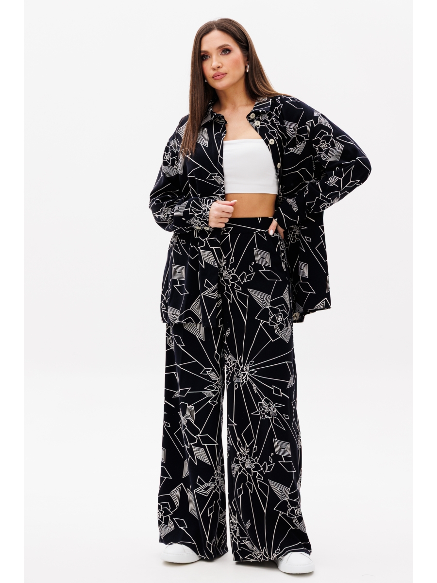 Прежде всего, его выделяет роскошная ткань с геометрическим крупным рисунком, которая позволяет создать такой великолепный вариант брючного комплекта, который составит конкуренцию любому платью.