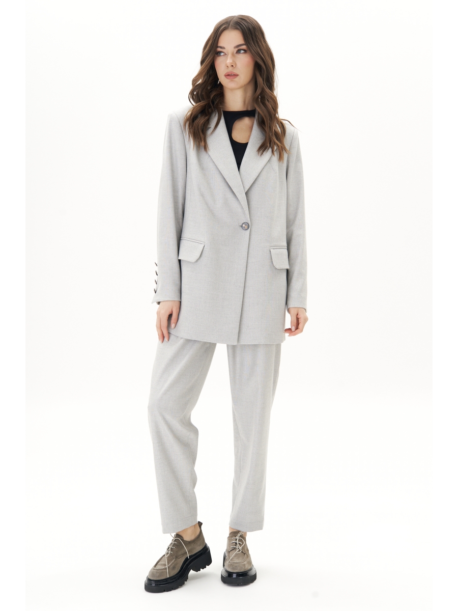 Свободный упрямлённый пиджак, оверсайз силуэта, втачного покроя со смещённой застёжкой на петлю и пуговицу, пиджачным классическим воротником. Полочка с отрезным бочком, прорезным карманом с клапаном и рамками, нагрудной вытачкой от линии лацкана. Спинка со средним швом, отрезным бочком и плечевой вытачкой от линии горловины спинки. Рукав двухшовный, с отлётной шлицей и декоративными пуговицами.
