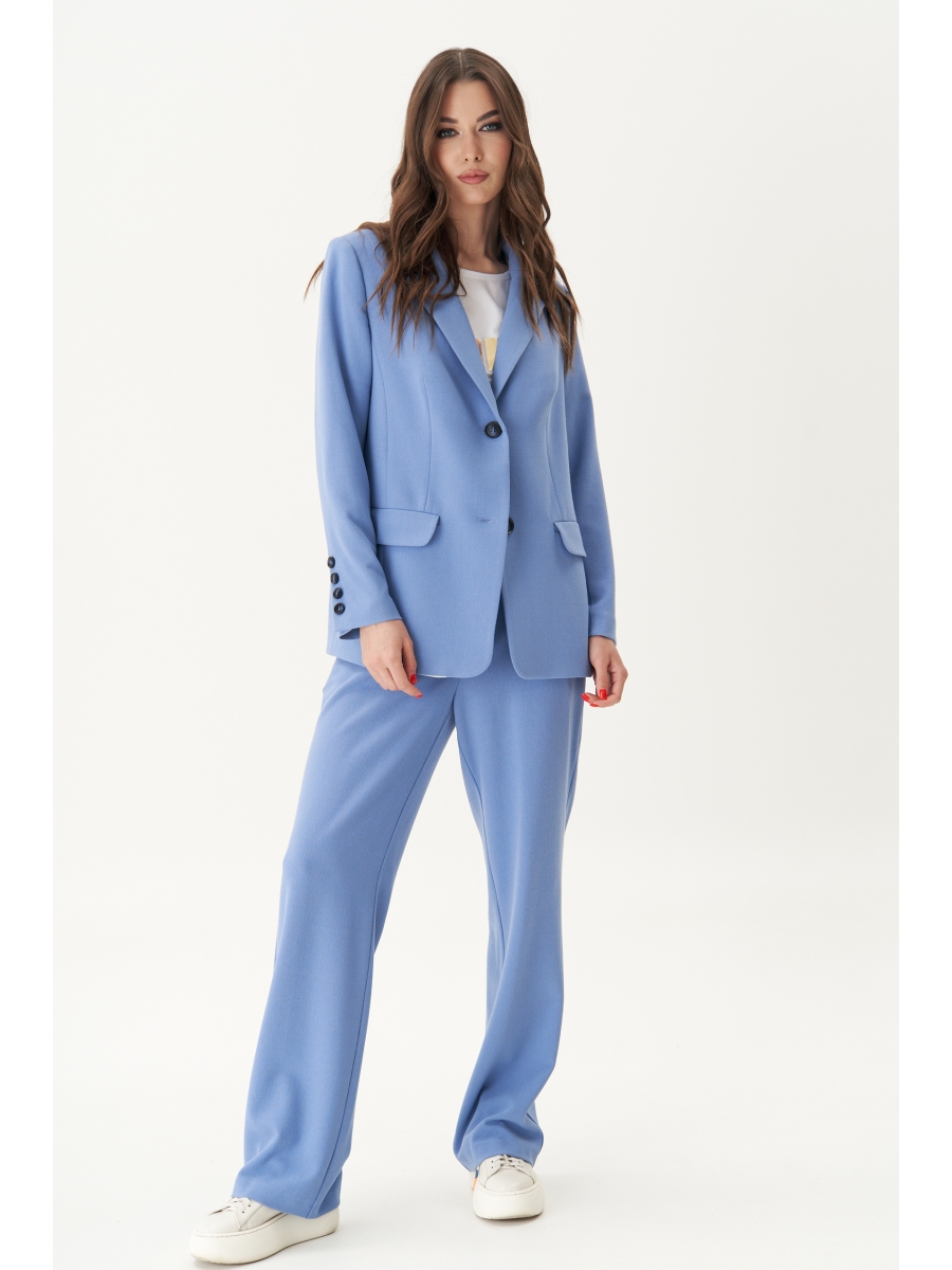 Жакет свободного силуэта, втачного покроя с классическим английским воротником. Полочка с центральной застёжкой, отрезным бочком, нагрудной вытачкой и прорезным карманом с клапаном. Спинка с центральным швом и плечевой вытачкой. Рукав двухшовный с отлётной шлицей по локтевому шву.