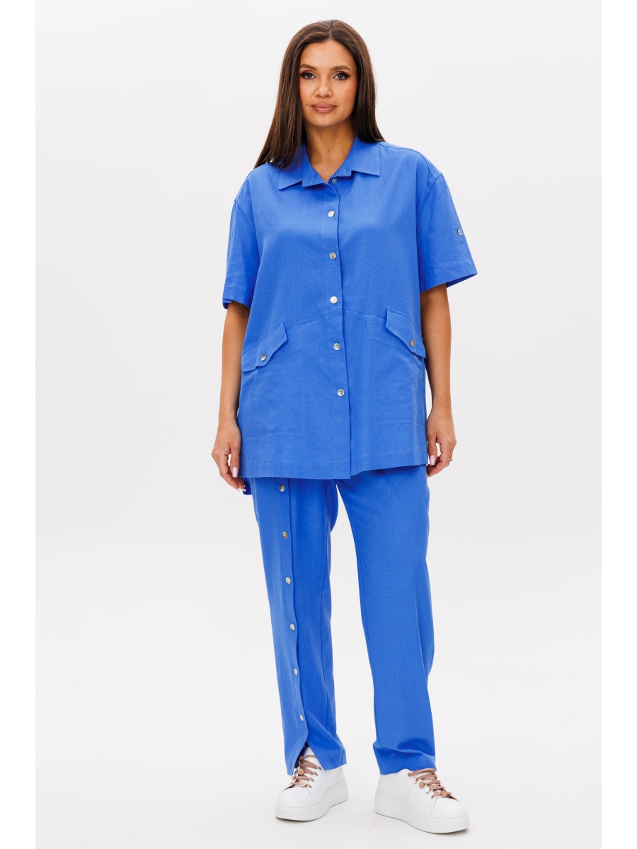 Свободная, упрямлённая рубашка и брюки в расслабленном стиле. Покрой - рубашечный, воротник классический рубашечный, застёжка центральная. Полочка с диагональным членением и карманом с клапаном. Спинка с отрезной кокеткой и мягкими складками. В боковых швах - разрезы. Рукав с отделочной пуговицей.