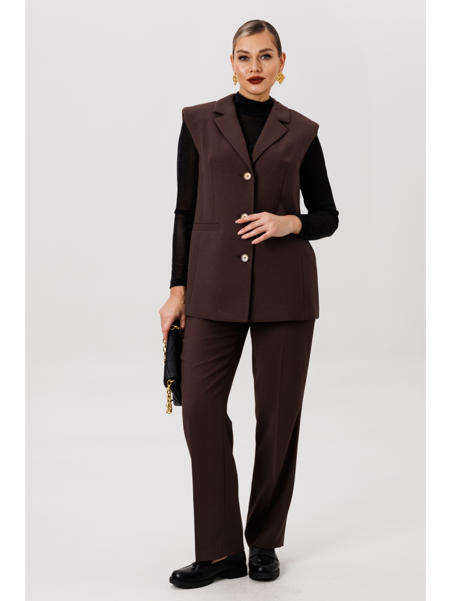 Полуприлегающий удлинённый жилет и прямые брюки отлично подчёркивают фигуру, а слегка расширенные плечи жилета придают дополнительную изюминку образу.