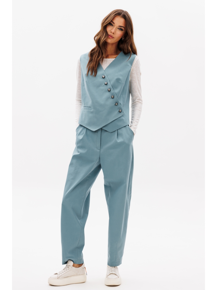 Жилет полуприлегающего силуэта с асимметричной застёжкой, фигурной линией низа и регулирующийся кулисе по спинке. Полочки с отрезным бочком и нагрудными вытачками, спинки - с центральным швом, отрезным бочком и регулирующийся кулисой с фиксаторами.