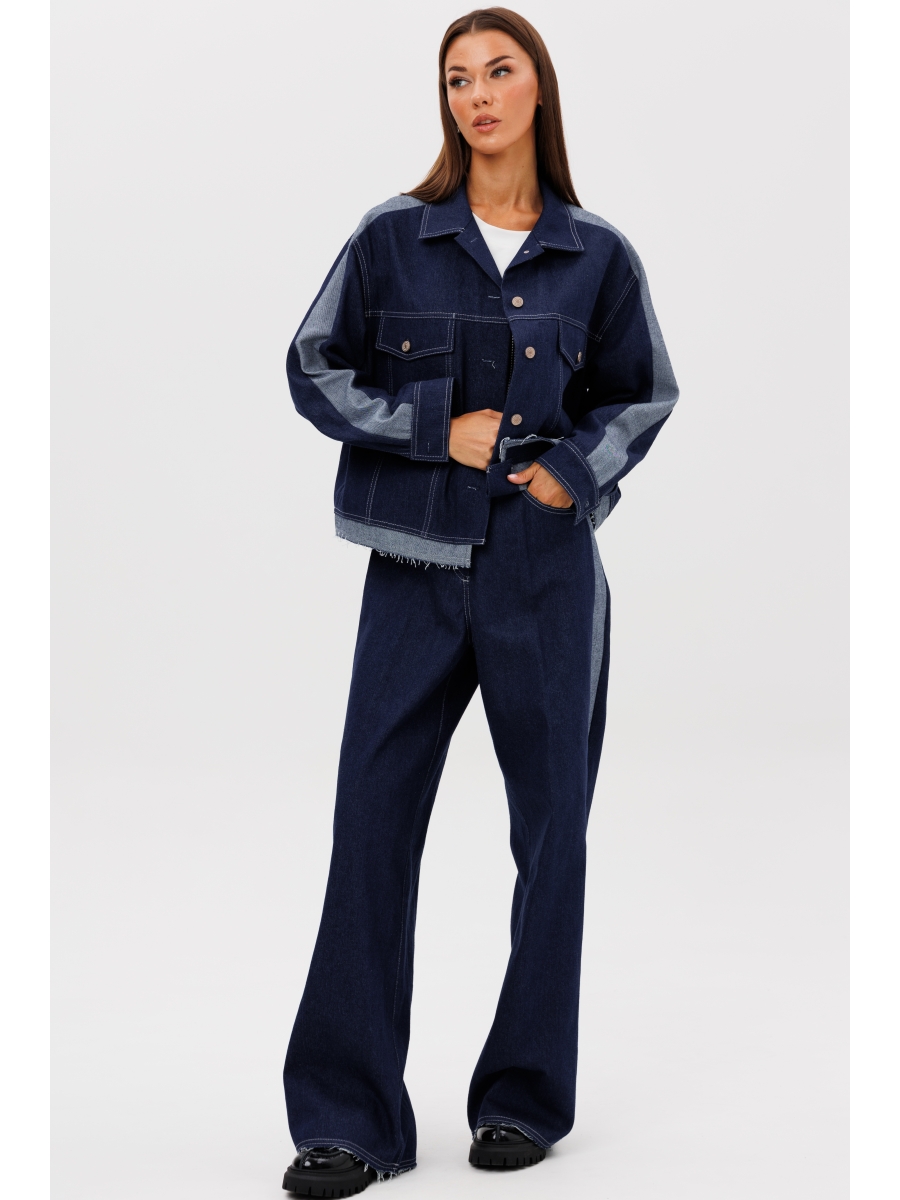 Свободный силуэт, рубашечный покрой, втачной воротник, рукав с притачной манжетой. Полочка с отрезной кокеткой, рельефами и карманом с клапаном. Спинка с отрезной кокеткой и рельефами. Рукав с локтевым швом и разрезом в нём, отделочным лампасом по центру рукава из контрастного денима, мягкой складкой и притачной манжетой. По низу куртки - притачная отделочная полоса в цвет лампаса. Застёжка центральная на петли и пуговицы.