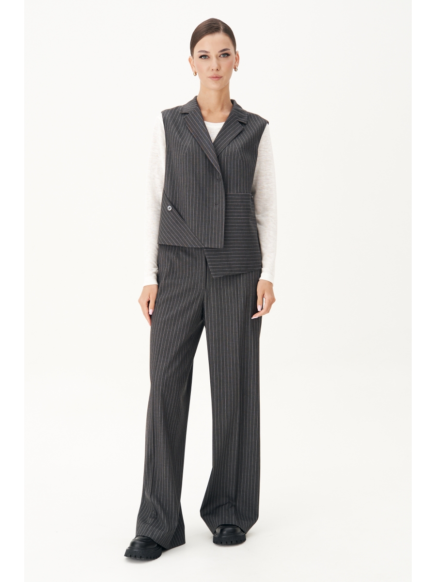 Жилет прямого силуэта с центральной застёжкой и фигурным разноуровневым бортом. Спинка с декоративной разноуровневой планкой, которая имитирует застежку.