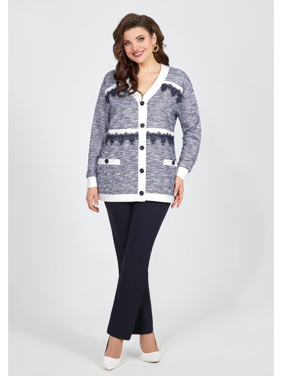 Блуза выполнена из меланжевого трикотажа и однотонного трикотажа, покрой свободный. Застежка по переду на планку из однотонного велюра, вырез горловины V-образной формы. Также на полочке обработаны горизонтальные подрезы, декорированы втачными планками и кружевом, обработаны листочки, имитирующие прорезной карман. Спинка выполнена из меланжевого трикотажа, по низу блуза обтачена планкой. Рукав втачной, из основной ткани, по низу на манжете.
