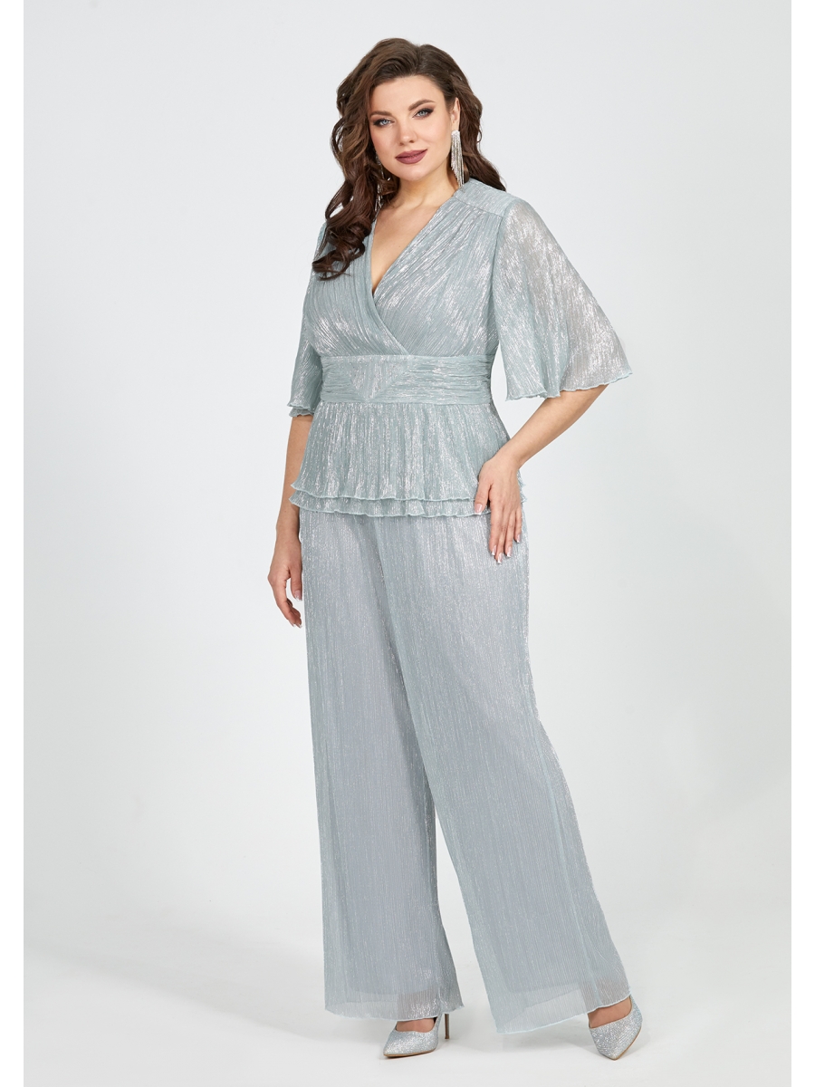 Блуза выполнена из плиссированной ткани, на трикотажной подкладке. Вырез горловины V-образной формы, по линии плеча обработаны кокетки, от кокетки вниз по лифу выполнена сборка. По линии талии подрез с фигурной вставкой из основной ткани, декорированной стразами, от линии талии двойная баска из плиссировки. Спинка с подрезом по линии талии, в подрез вставлена резинка для более хорошего прилегания. Рукав втачной, расклешенный к низу оптимальной длины.
