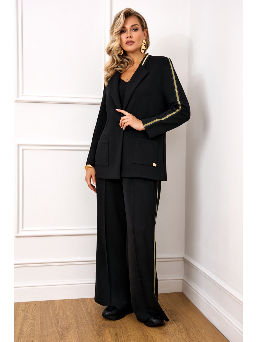 Жакет прямого силуэта, без подкладки. Перед жакета по горловине декорирован трикотажным довязом, что придает модели особую изящность. Жакет с накладными карманами и декорирован пришивным металлическим украшением, с застежкой на пуговицу. Рукав полной длины, декорированы пришивным трикотажным лампасом.