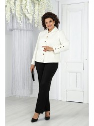 Жакет полуприлегающего силуэта, с центральной бортовой застежкой на 5 петель и 5 пуговиц. Длина жакета по среднему шву спинки 59 см. Перед с рельефными швами от пройм до низа проходящими не через центр груди, с нагрудной вытачкой от рельефного шва к центру. По переду расположен карман с листочкой в рельефе. Спинка со средним швом, с рельефными швами от пройм до низа. Рукава втачные, двухшовный, по низу рукава имитация шлицы, с застежкой на 4 пуговицы. Длина рукава 61 см. Горловина круглая с отложным воротником. Жакет на подкладке с плечевыми накладками.