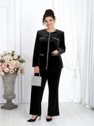 Премиальный костюм, выполненный в роскошном велюре, сочетает классический крой и стильные детали, создавая элегантный образ для делового, офисного или праздничного гардероба. Жакет полуприлегающего силуэта с безупречными линиями рельефных швов подчеркивает фигуру, а декоративная тесьма со стразами добавляет нотку утонченности в стиле Шанель. Застежка на пуговицы скрыта для минималистичного эффекта, а имитация карманов и прорезные карманы придают жакету современный и стильный вид.