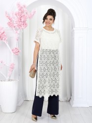 Туника полуприлегающего силуэта, выполнена из хлопкового кружева. Модель без застежки, без плечевых накладок, с высокими (от талии) разрезами в боковых швах. С изнанки разрезы обработаны хлопковой тесьмой в цвет кружева, закрепленной с лицевой стороны отделочной строчкой шириной 3 см. Круглый вырез горловины переда и спинки обработан обтачкой из костюмно-плательной ткани в цвет кружева; ширина отделочной строчки по горловине 2 см. Рукав втачной, короткий. Длина туники – 117 см; длина рукава – 22 см.