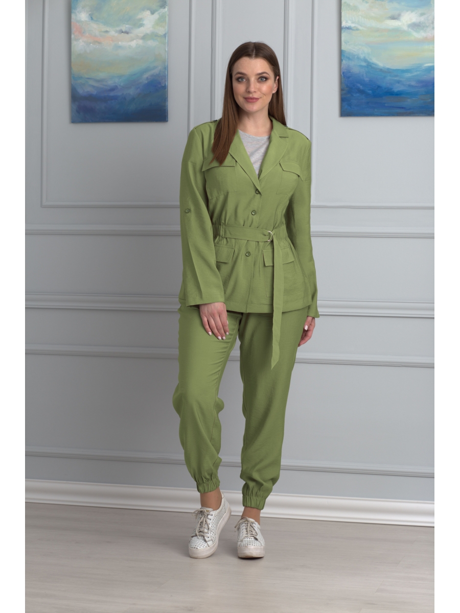 Костюм состоит из жакета и брюк. Резинка по поясу жакета. Жакет отрезной по линии талии, без подкладки, дополнен (не съемным) поясом, рукав 3/4 на застежке и длинный в отпущенном состоянии. Рукав втачной, двух шовный. Застежка однобортная, на пуговицы. Накладные карманы в «рамку» с клапаном. Спинка со средним швом.