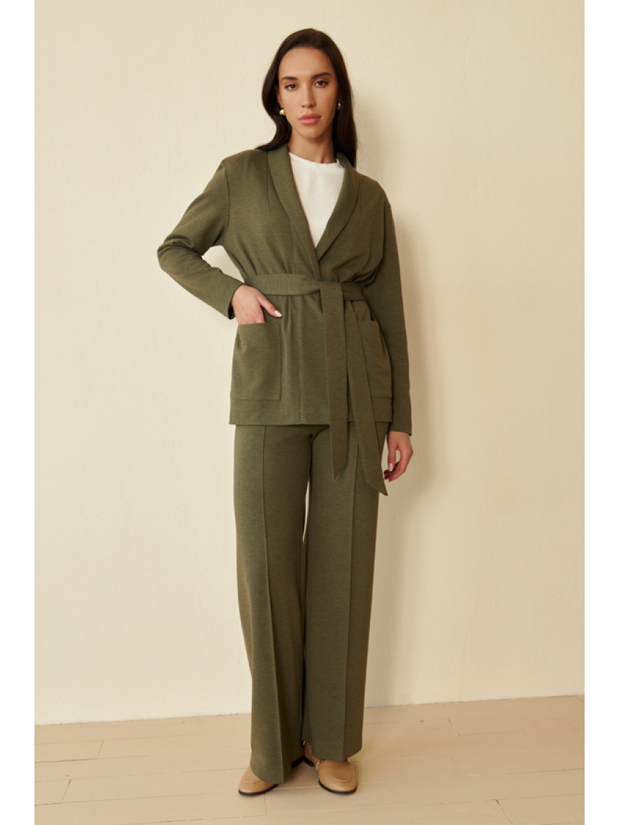 Оформить заказ →Костюм из эластичного полотна. Брюки прямого силуэта. Пояс притачной с эластичной резиной. На передней части брюк застрочены стрелки. Жакет прямого свободного кроя с женственным шалевым воротником. На передней части изделия накладные карманы. Втачной рукав. Изделие с плечевыми накладками, которые при желании можно убрать. В комплекте пояс из основной ткани.