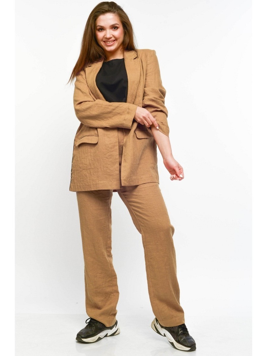 Жакет прямого силуэта без подкладки, на застежке на петлю и пуговицу. Перед без вытачек с карманами "в рамку" с клапанами. Спинка со средним швом. Воротник стояче-отложной на отрезной стойке с лацканами. Рукав втачной двухшовный, длинный.