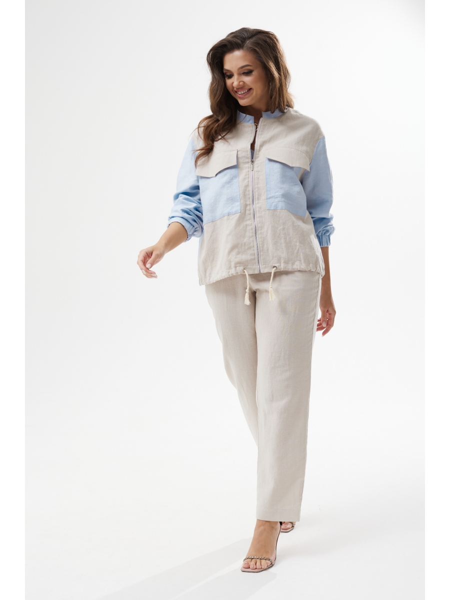 Жакет двухцветный свободного силуэта со спущенным плечом, рубашечным рукавом. Рукав на манжете с резинкой. Воротник стойка. Застежка - металлическия молния. По низу кулиса со шнурком. На груди накладные карманы с клапаном.