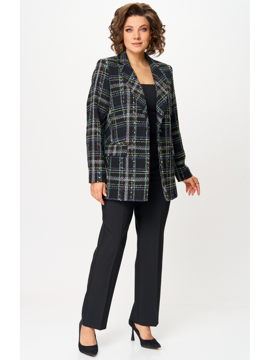 Жакет удлиненный, свободного силуэта с центральной бортовой застежкой на пуговицы до линии перегиба лацкана. По переду имеется отрезной бочок и вертикальные вытачки. С прорезными карманами с клапаном и двумя обтачками. Спинка цельная. Воротник пиджачного типа. Рукав двухшовный, втачной. Жакет на подкладке.