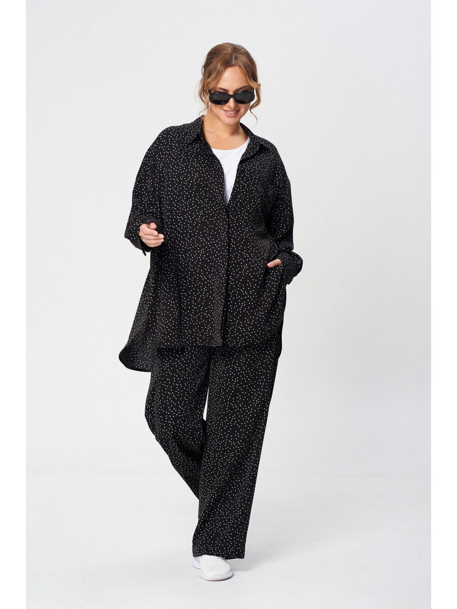 Комплект женский двойка состоит из рубашки и брюк, выполнен из плательно-костюмной ткани с принтом мелкий горошек.