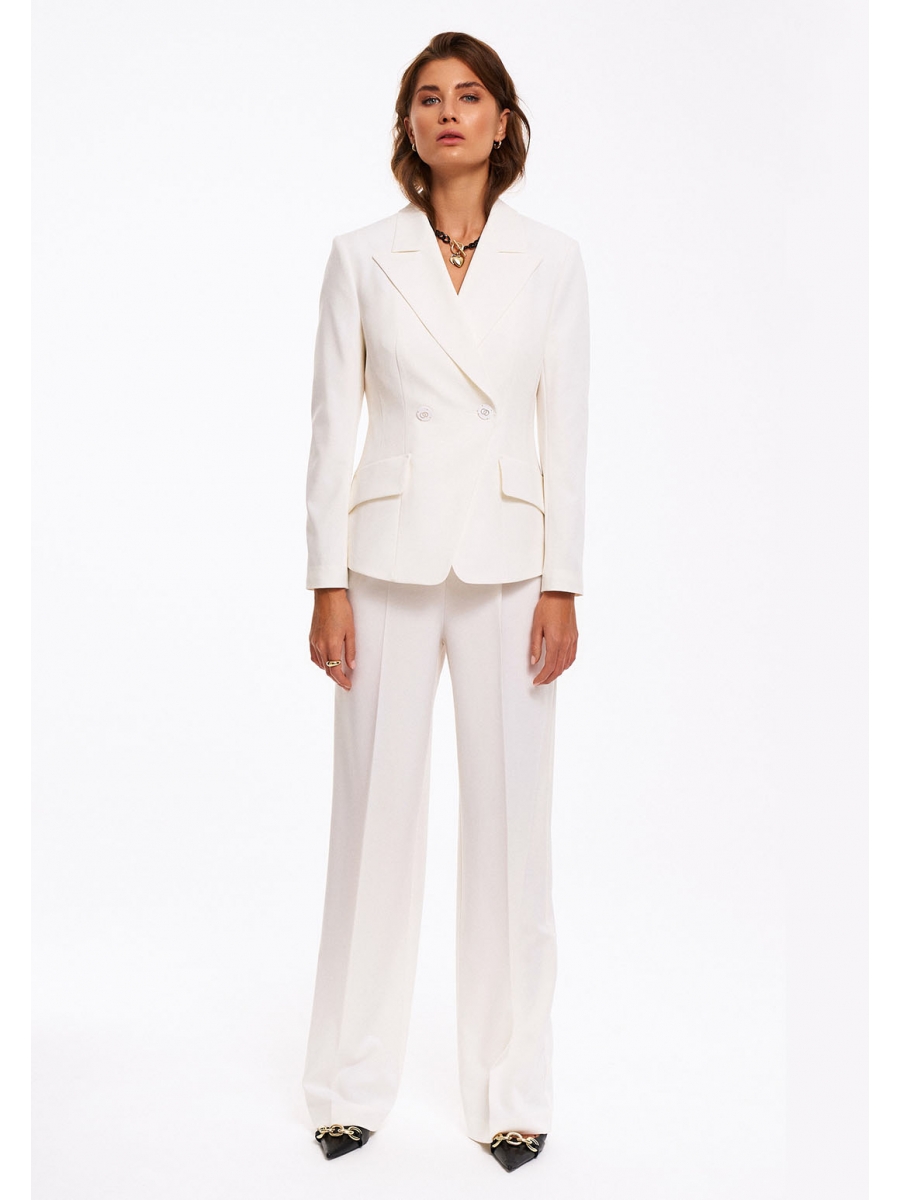 Двубортный жакет приталенного силуэта с клапанами по переду и дизайнерским элементом по спинке в виде небольшой прорези на уровне талии и застёжки на пуговицу.
