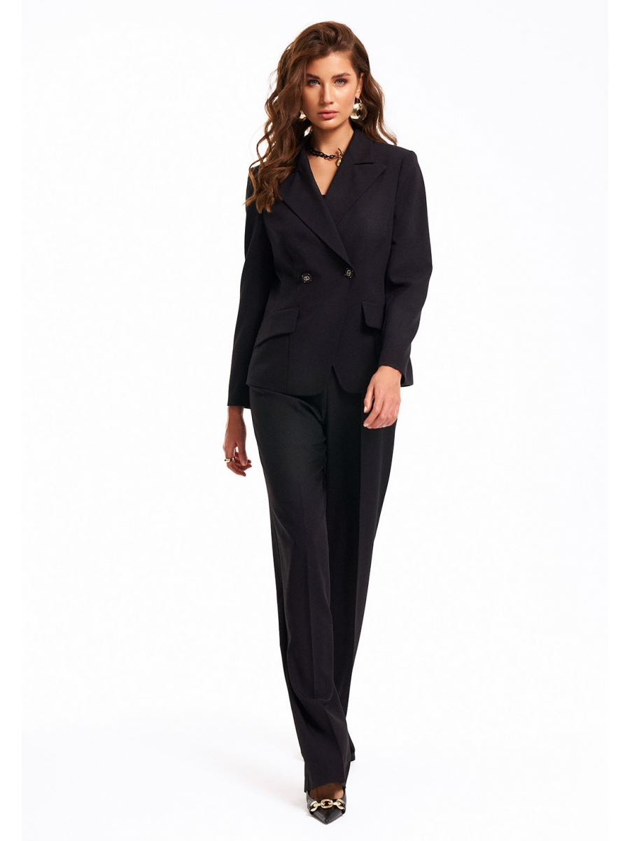 Двубортный жакет приталенного силуэта с клапанами по переду и дизайнерским элементом по спинке в виде небольшой прорези на уровне талии и застёжки на пуговицу.