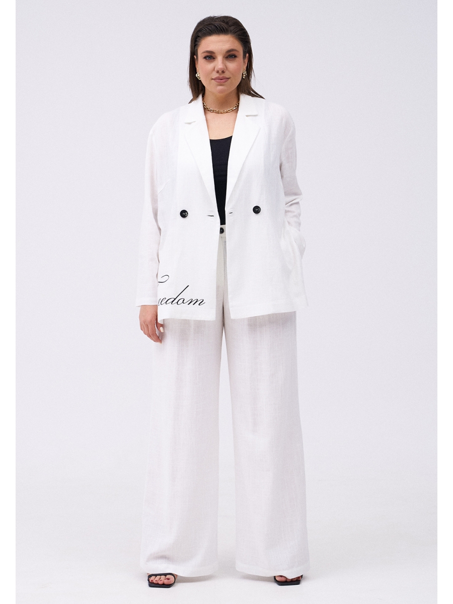 Двубортный жакет прямого силуэта без подкладки со спущенной линией плеча и застёжкой на пуговицы. Справа по переду контрастный принт. По бокам разрезы.